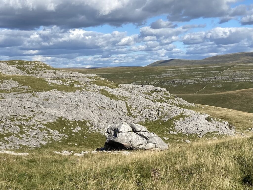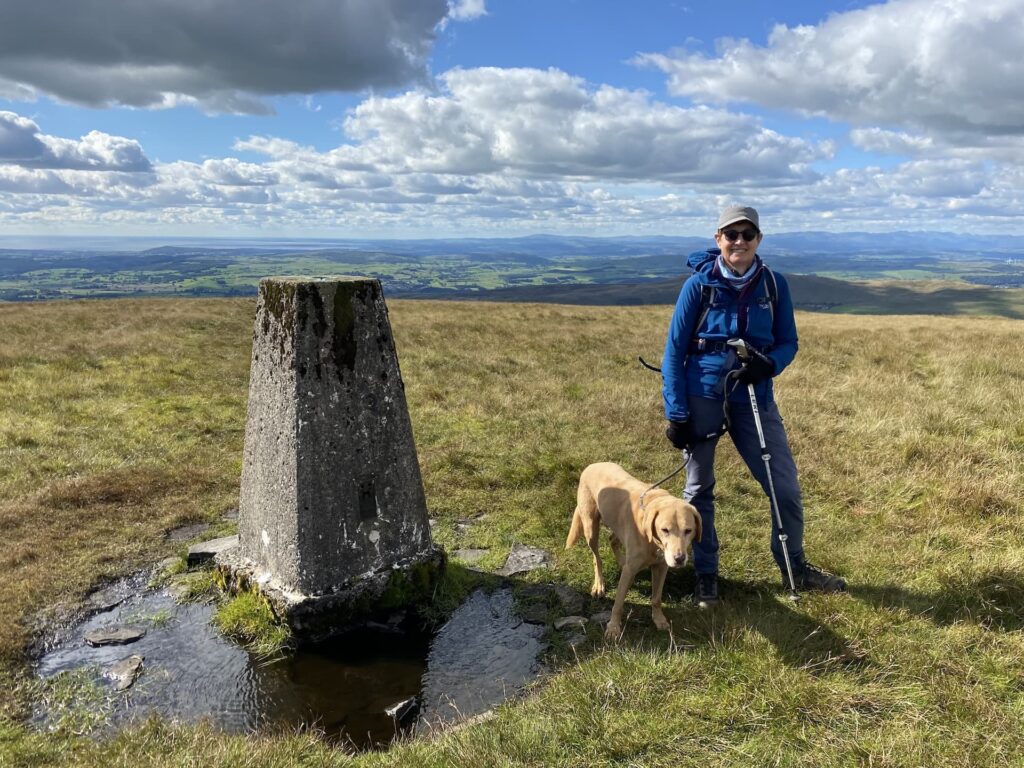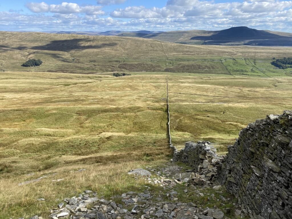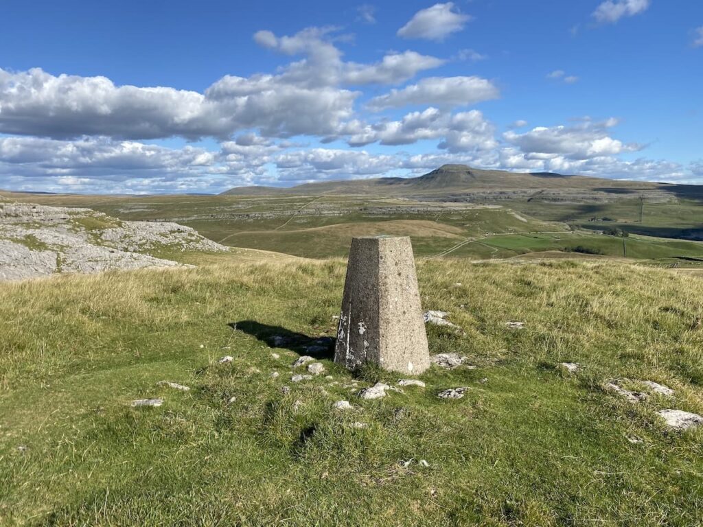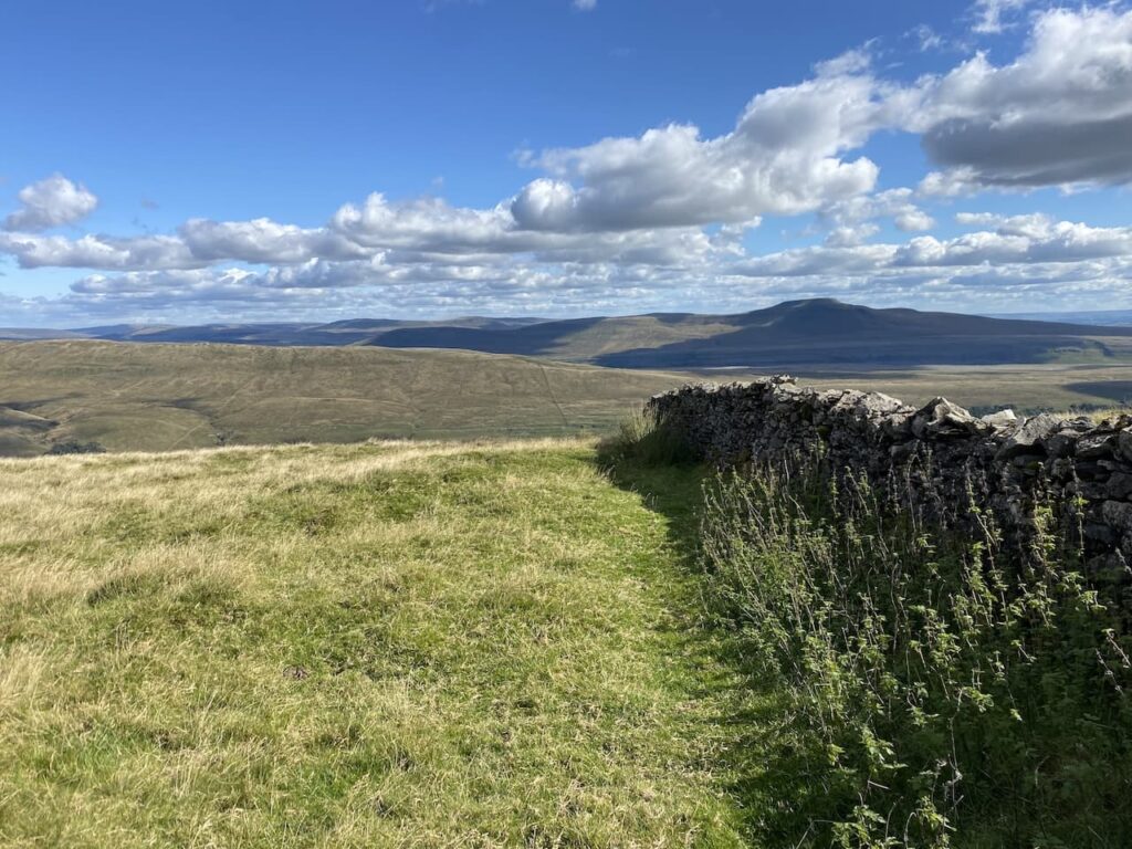 We leave the trig in an easterly direction following a faint path heading back towards the dry stone wall. In the distance we can see Ingleborough.
