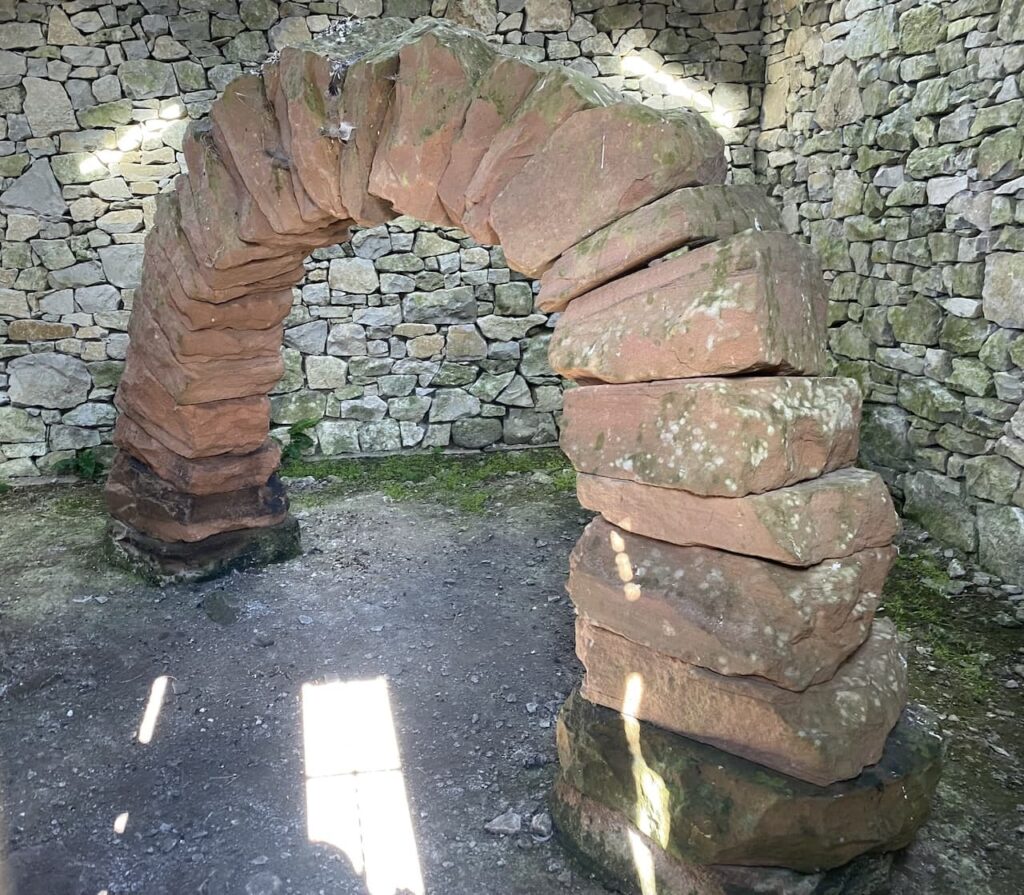 Inside is a sandstone arch which is permanently located here. This arch formed part of a Cumbrian Sheepfolds project, the artist Andy Goldsworthy erected and dismantled a red sandstone arch on 23 sheepfolds along the drove roads between Dumfriesshire and Lancashire. The arch was erected for the final time in 2002 and can now be seen through a viewing window.