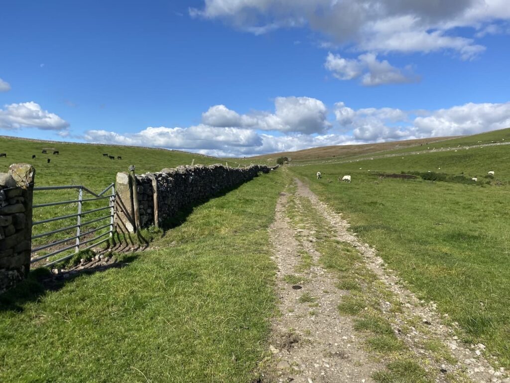 The track continues through gates into pasture fields.
