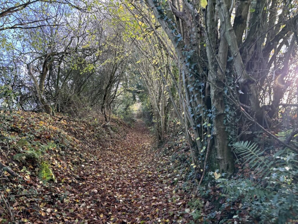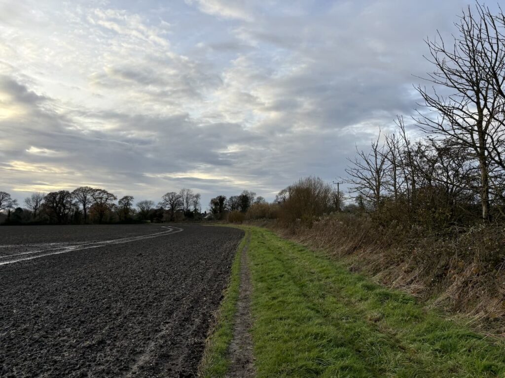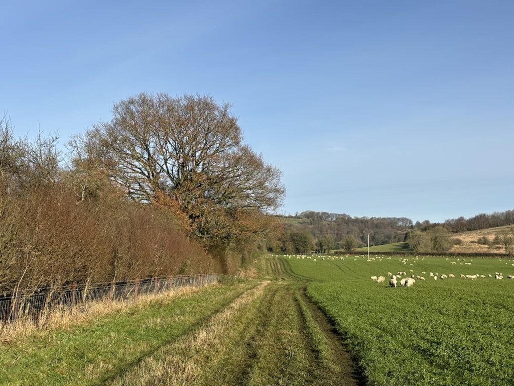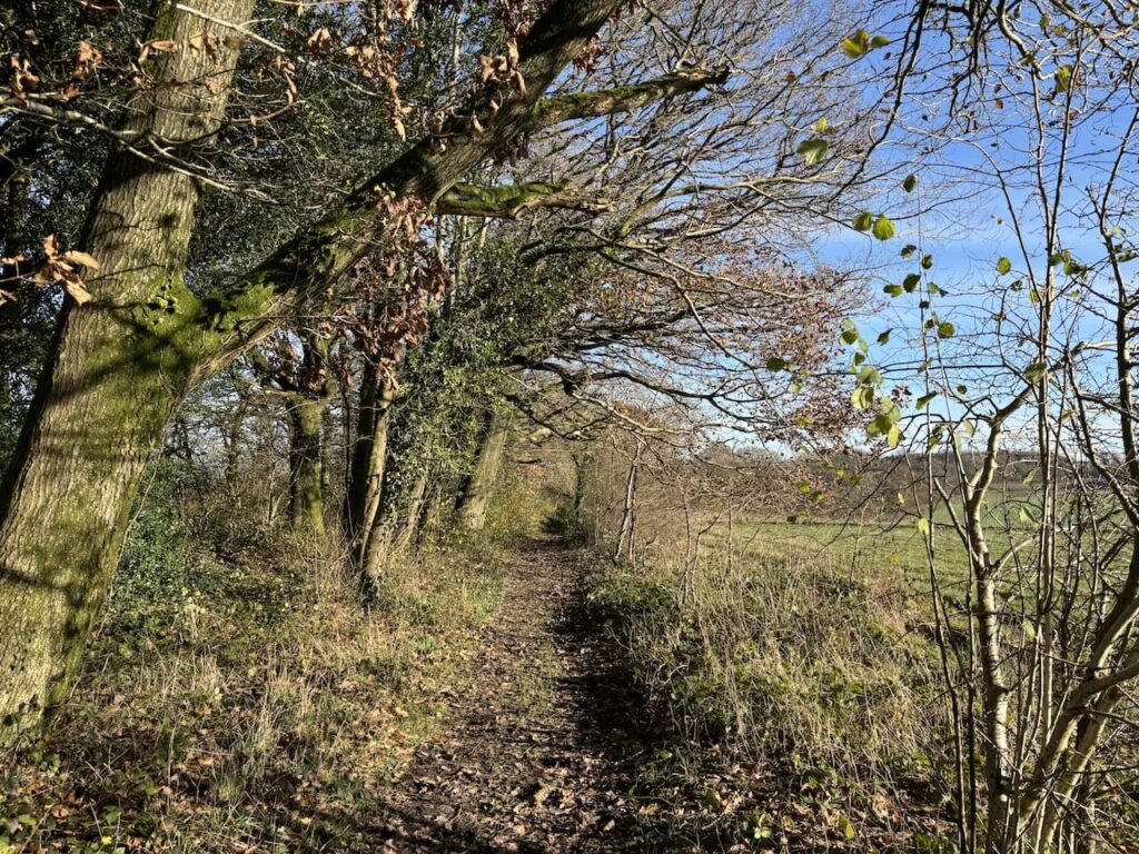 On reaching Sunnyhill Lane we cross and continue heading north on the White Horse Trail along the left hand edge of a field.