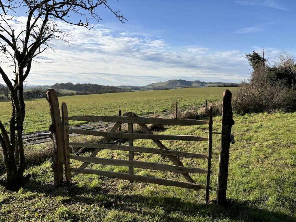 We cross a stile and then reach a gate where the path splits three ways. We go straight ahead into the field with the fence line to our right, following the way marker for the Mid Wilts Way.