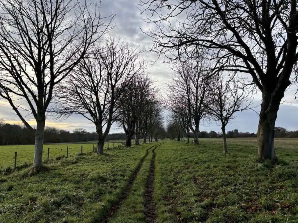 We go straight on at the first crossing of paths continuing for a further 250 metres to another junction of paths, this time we turn right along a tree-lined route towards Milton Lilbourne.