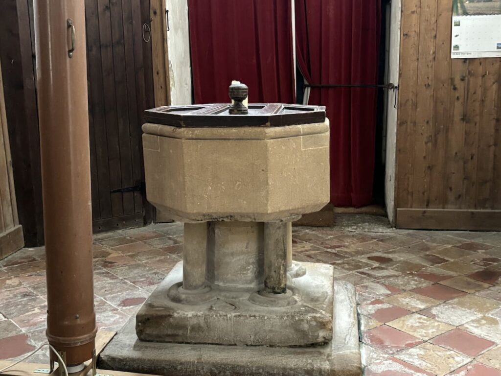 The font is an octagonal 19th century bowl, on a 13th century five-columned base.
