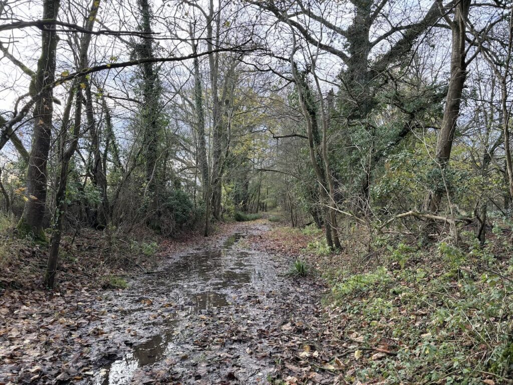 After passing through a parking area we cross the minor road and continue straight on along Mud Lane, following recent wet weather it is very obvious why it has this name. But after an initial very muddy patch the route becomes firmer as it passes alongside woodland.