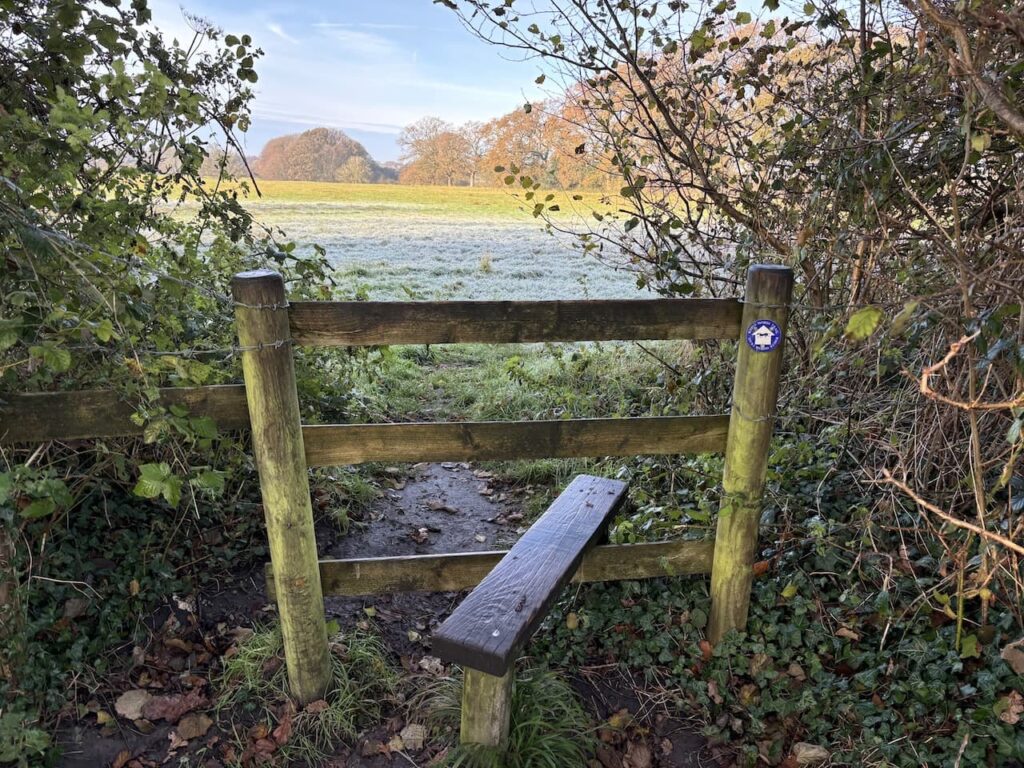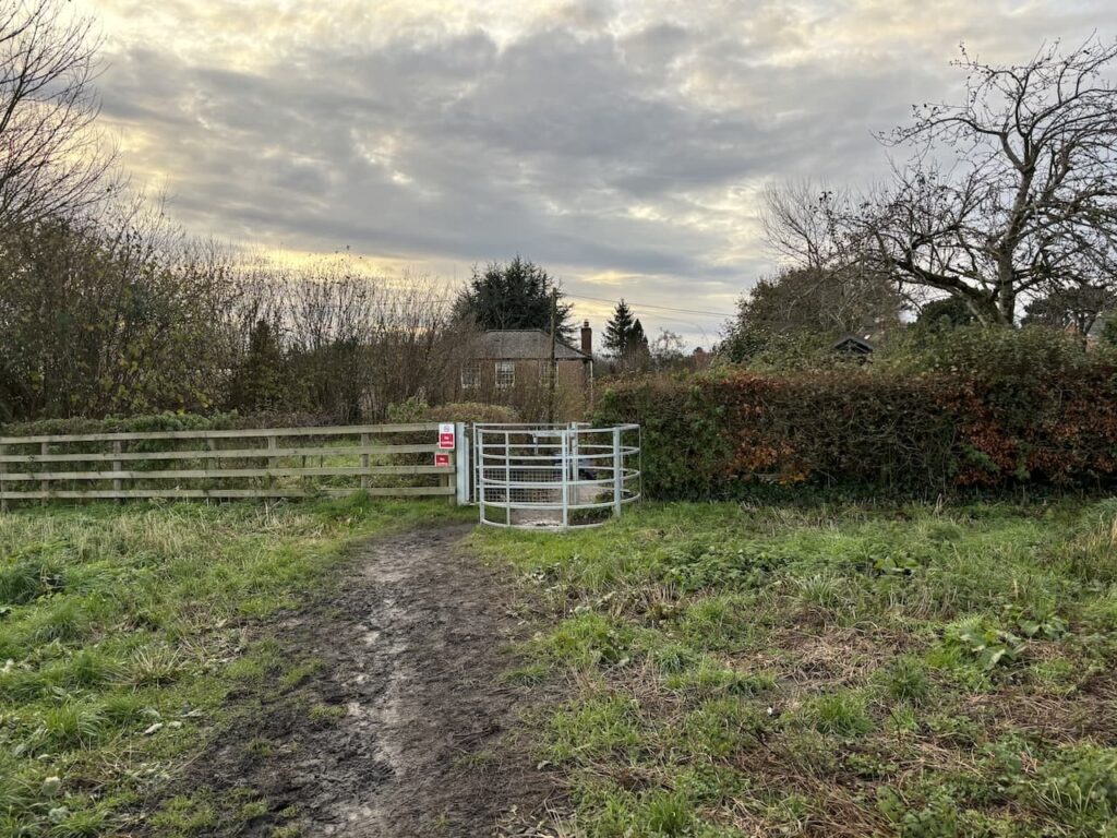 About 350 metres from the canal, and just after passing the driveway to Inlands Farm, we cross a stile on the left to follow the White Horse Way footpath across fields.