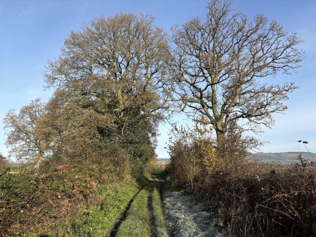 At the minor road we turn right and walk down the hill for just over two hundred metres and then as the road bends to the right we keep straight on along a track heading south towards the Kennet and Avon Canal.