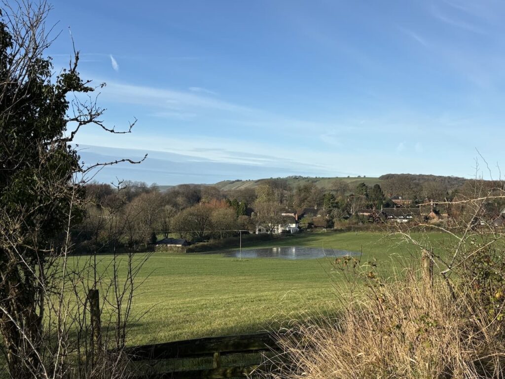 After crossing a lane we head across a field with the village of Oare to our left with Huish Hill behind it. We comment on the field being flooded but strangely don’t equate it to any issues we might face later in our walk.