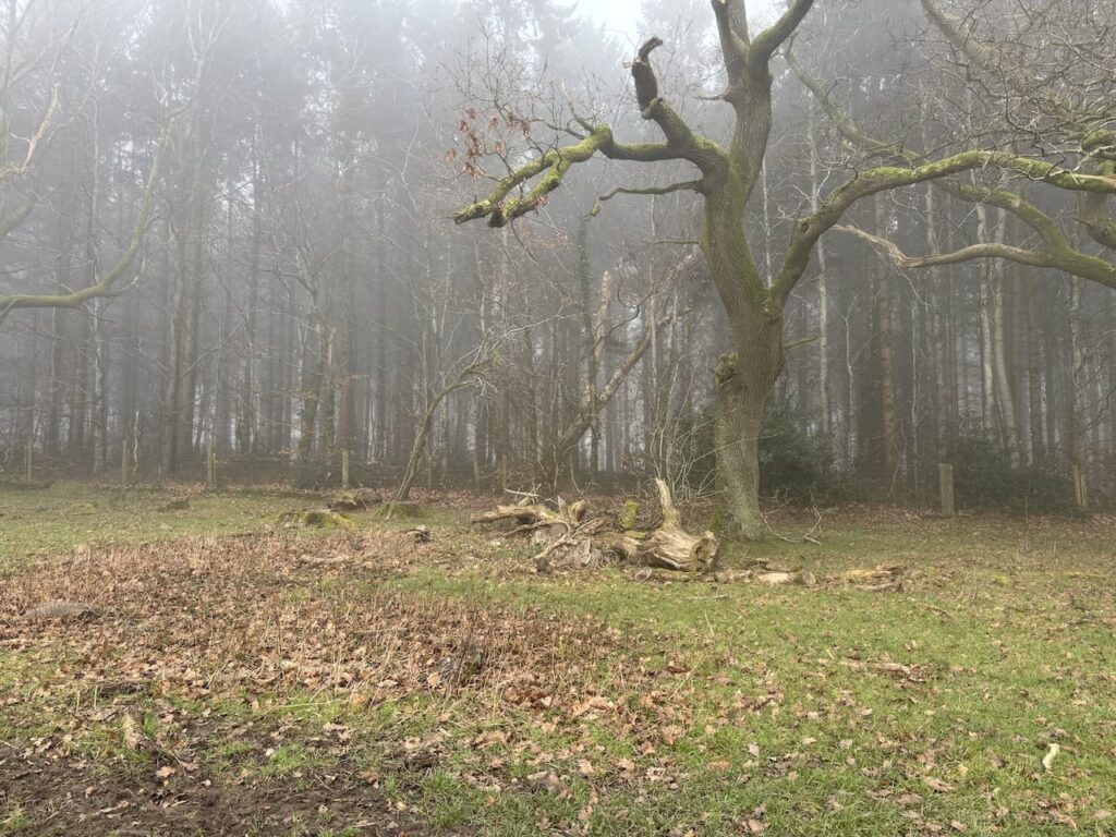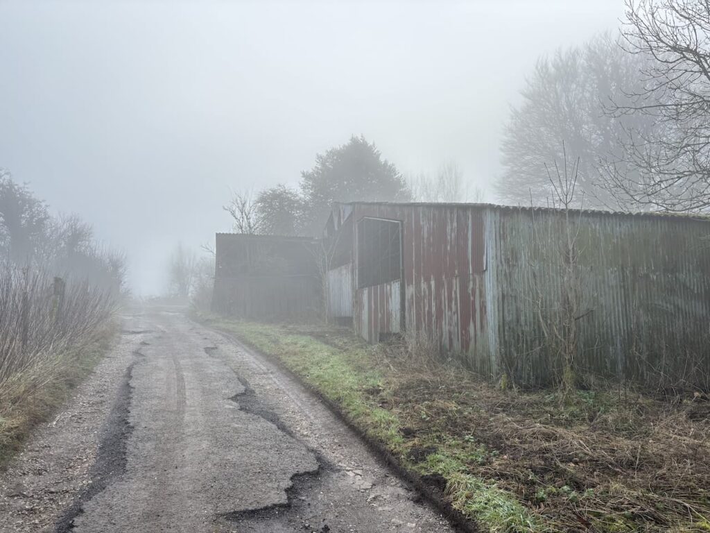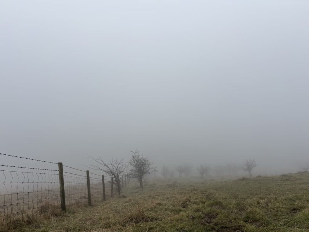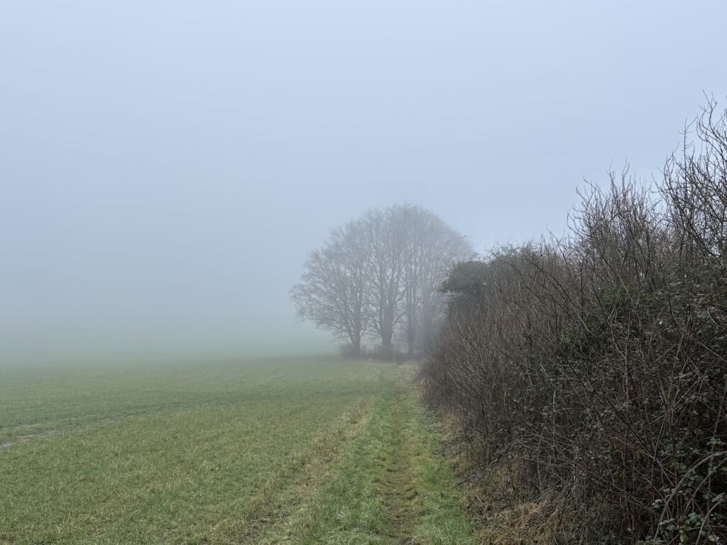 After going through a gate there is a steep ascent of Huish Hill and I am pleased to reach a bench. I had anticipated stopping here for some refreshment whilst enjoying the view. However, low cloud means there is poor visibility and I have to imagine the stunning view across the Vale of Pewsey that I know you get from this spot.