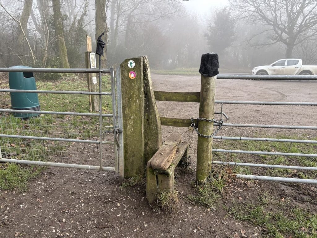 On reaching Sunnyhill Lane I cross and continue heading north on the White Horse Trail for another 300 metres then cross a stile on the left and head diagonally across a field to a stile in the north-east corner.