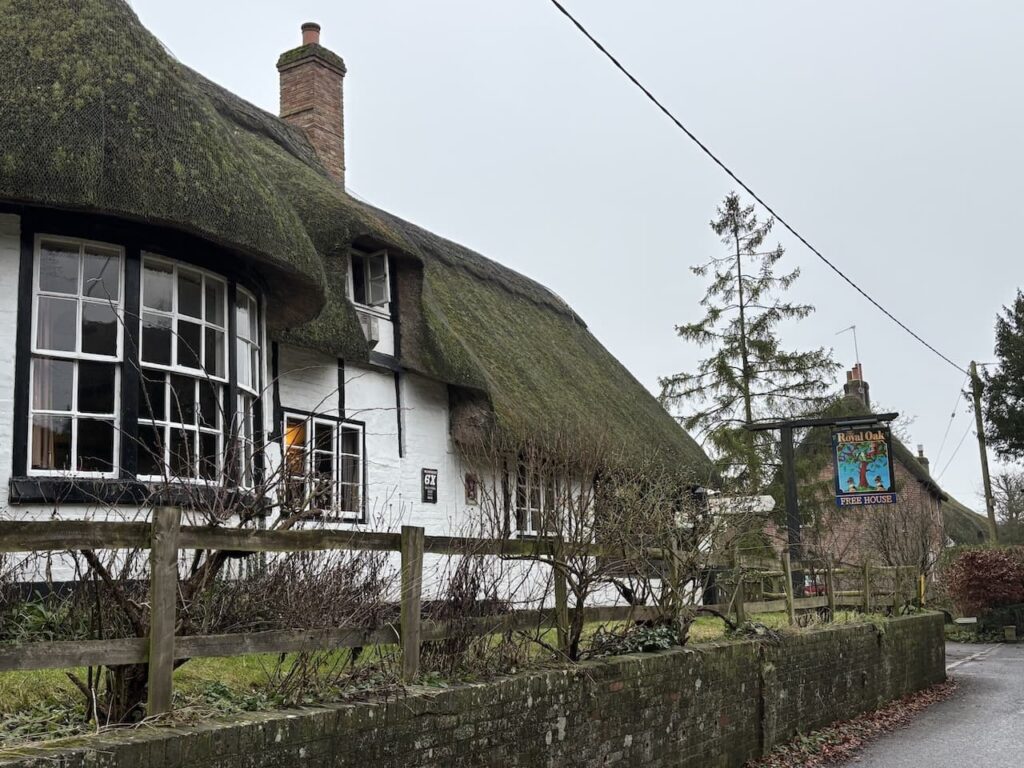 In the village I join the road and head south to pass the attractive thatched Royal Oak pub.