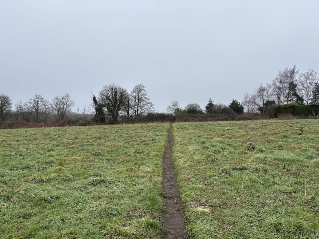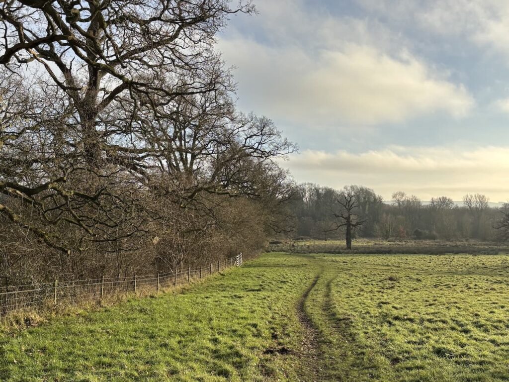 About 350 metres from the canal and just after passing the driveway to Inlands Farm I cross a stile on the left to follow the White Horse Way footpath across fields.