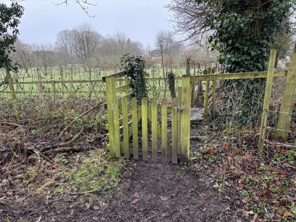 The path now goes through a paddock, about midway across I go through a gate on the left and follow a narrow path between gardens.