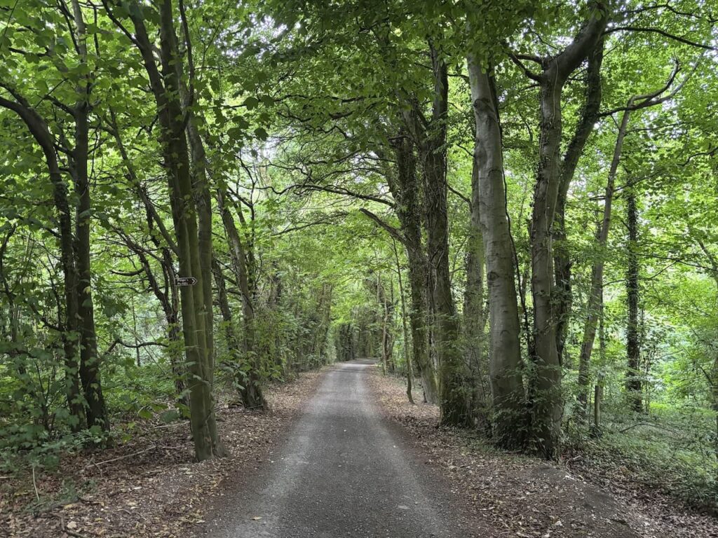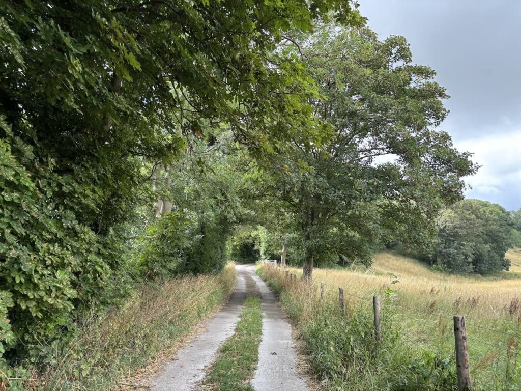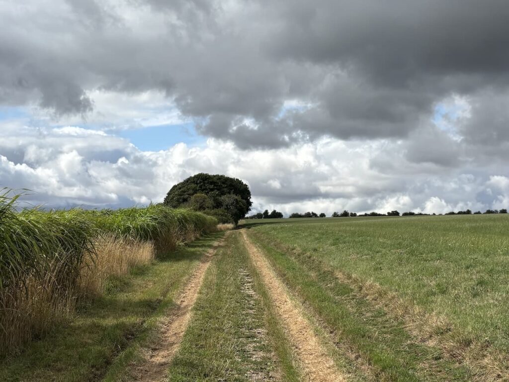 At a fork in the track I go left and then leave the farm driveway by a footpath sign on the left. The route follows a grassy track heading steadily uphill towards a copse.