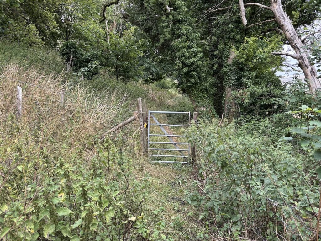 On leaving the woods the path goes through a gate and along the edge of a field.