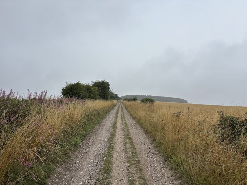 After 400 metres I emerge from the trees and the track opens out as I head towards White Sheet Hill. Usually there are some stunning views from here but today there is low cloud and drizzle in the air so I don’t get the full benefit.