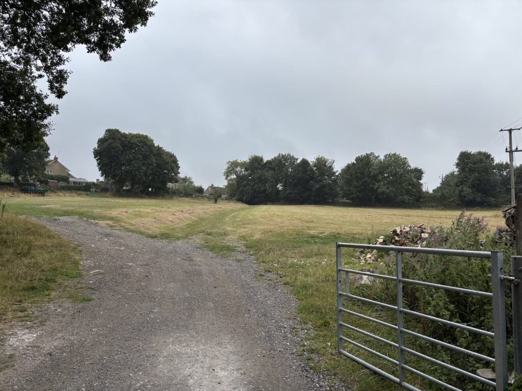 After 100 metres I take a path on the left through the hedge line to reach a gate into a field and I continue with the fence line on my right now heading towards Norrington Farm.