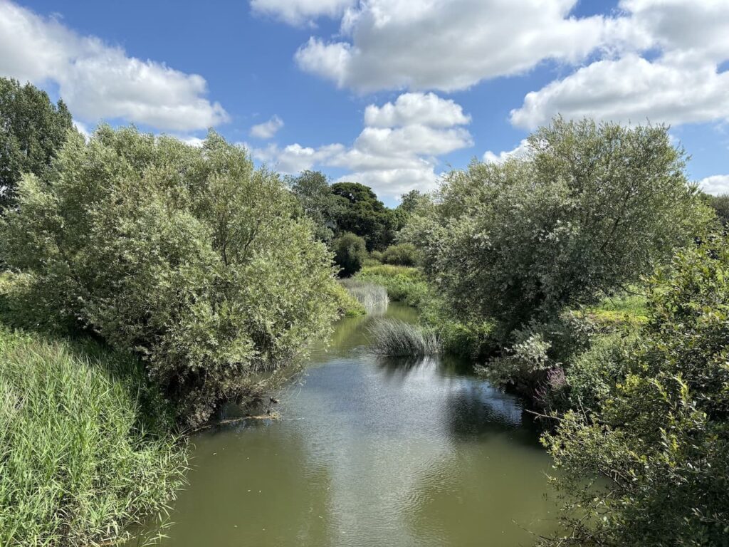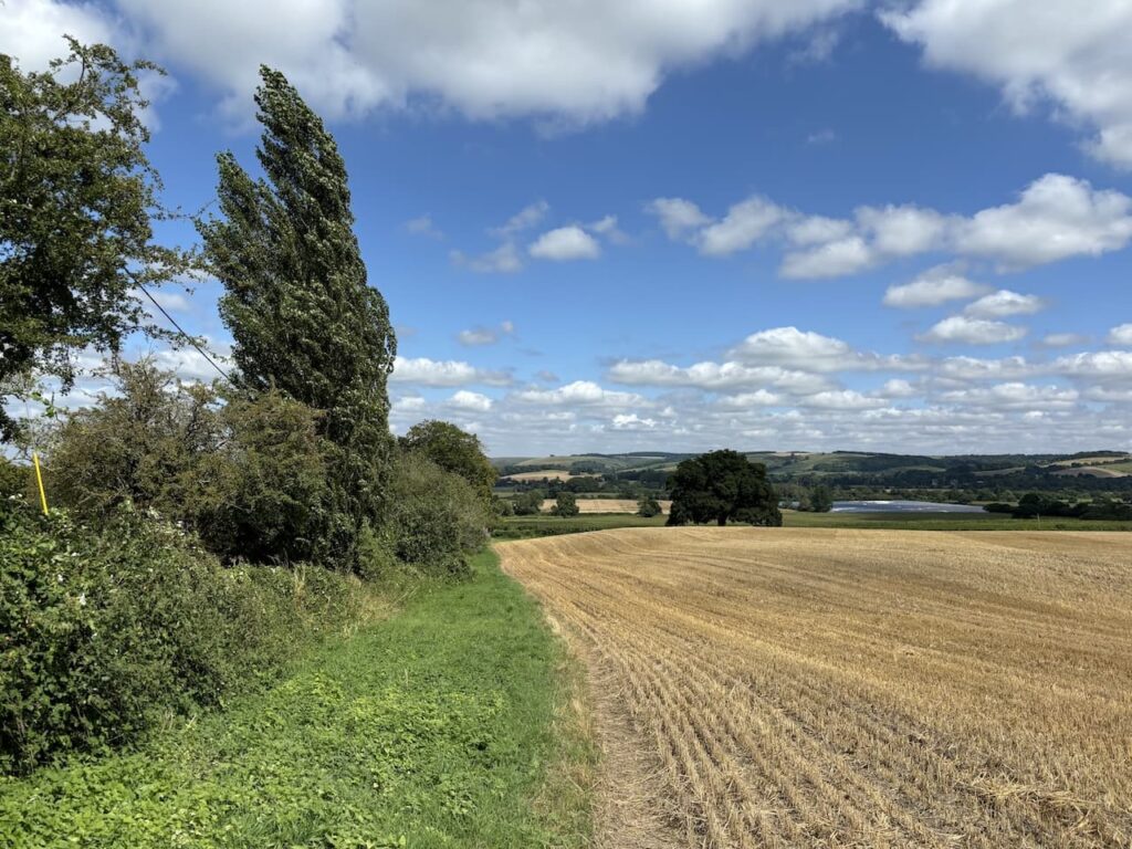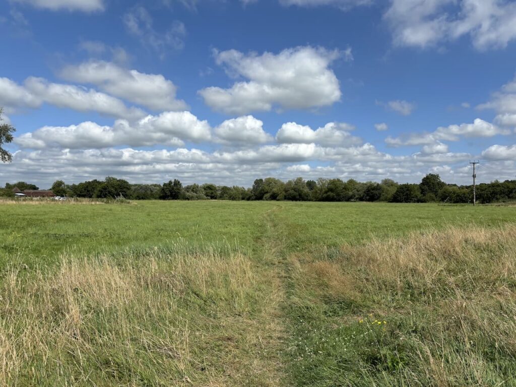 For much of our walk, on the first section of the St Edward’s Way, yesterday the weather was overcast and a bit muggy but today’s forecast promises clearing skies and plenty of sunshine. So before heading out I apply lots of suncream and pack more in my rucksack.