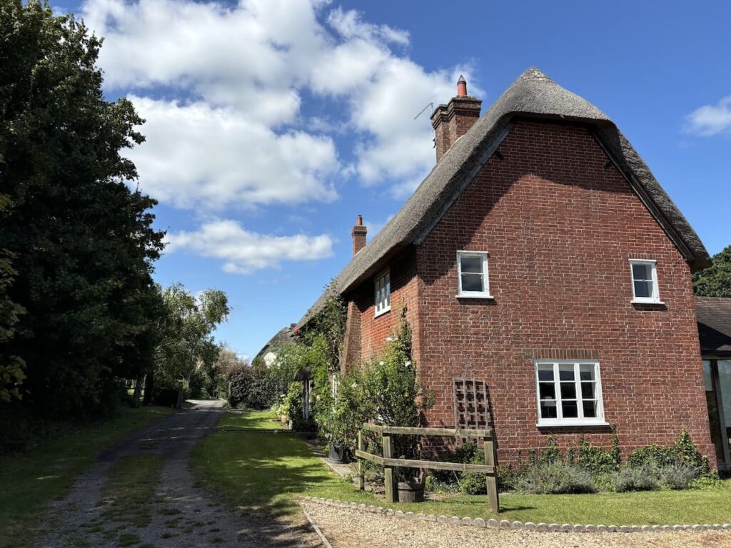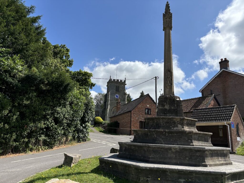 As well as being on the St Edward’s Way we are now also following the route of the Stour Valley Way, this takes us across an open access field and then through a couple of fields of pasture on the way to Child Okeford. In the village we join Haywards Lane and turn left which takes us into the centre of the village.