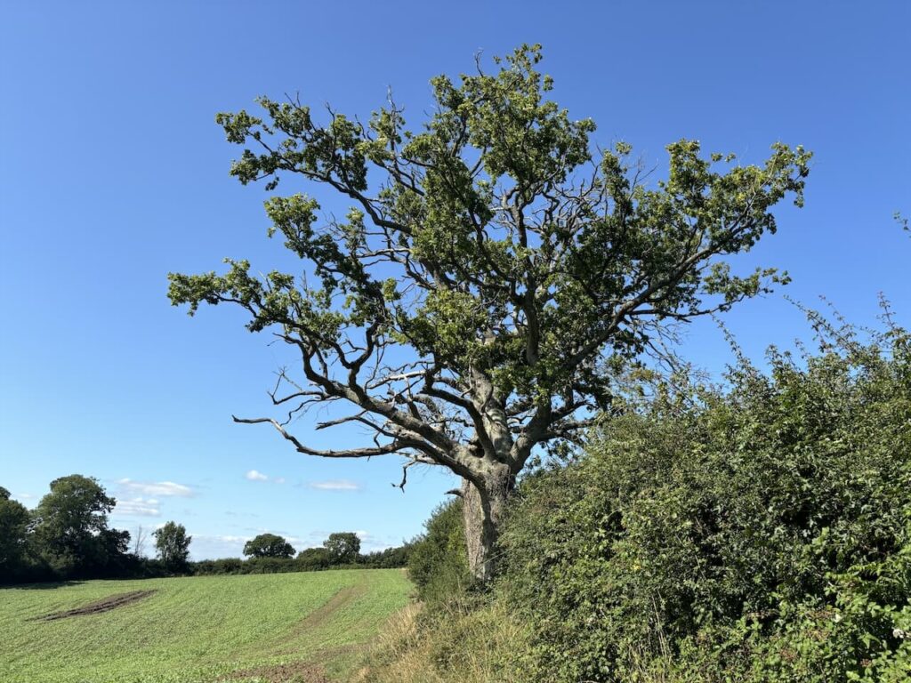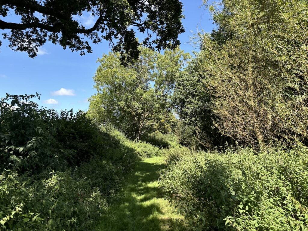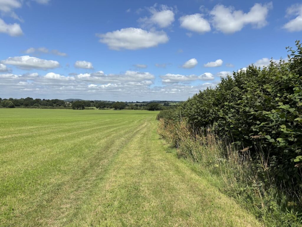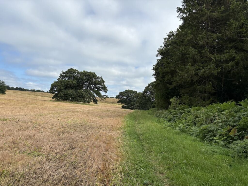 On reaching the lane we turn right and then almost immediately take a bridleway on the left which heads along the side of a field with the hedge to our right.
