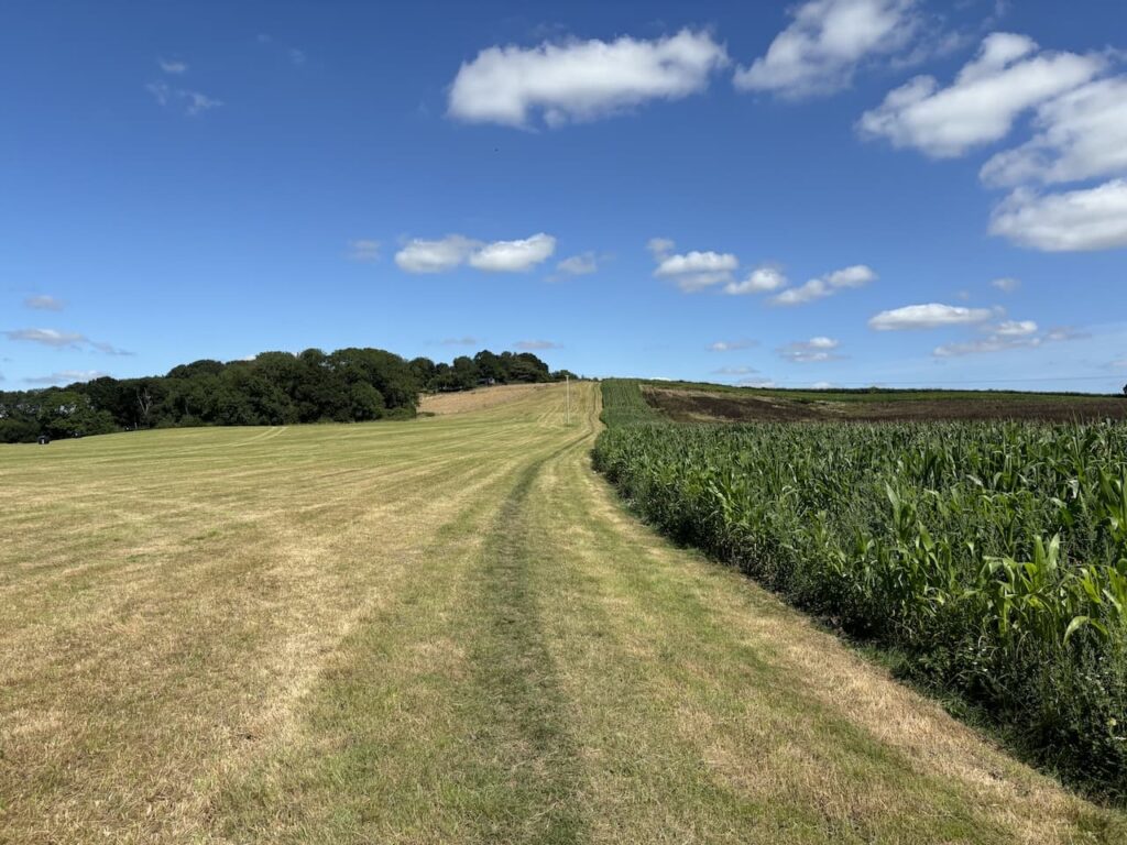 Reaching the edge of the woods we turn right along a path.