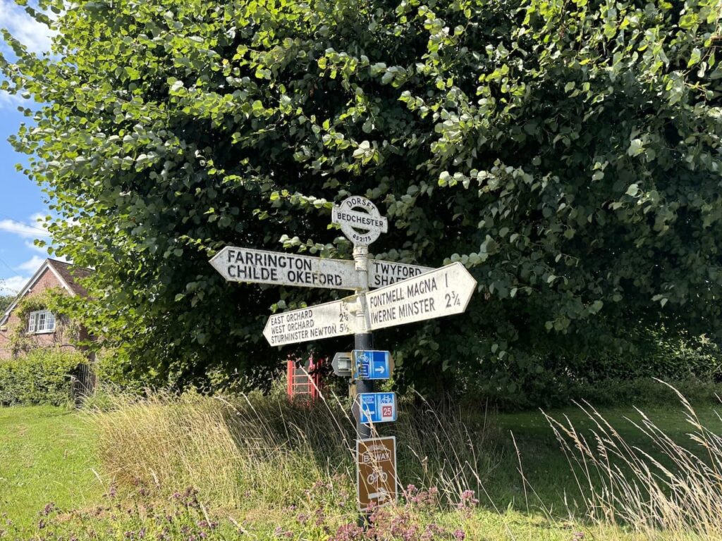 At the minor road we turn left and walk uphill into the hamlet of Bedchester. At the cross roads stands a finger post with the village name and OS Grid reference, this feature can often be seen on old Dorset fingerposts.