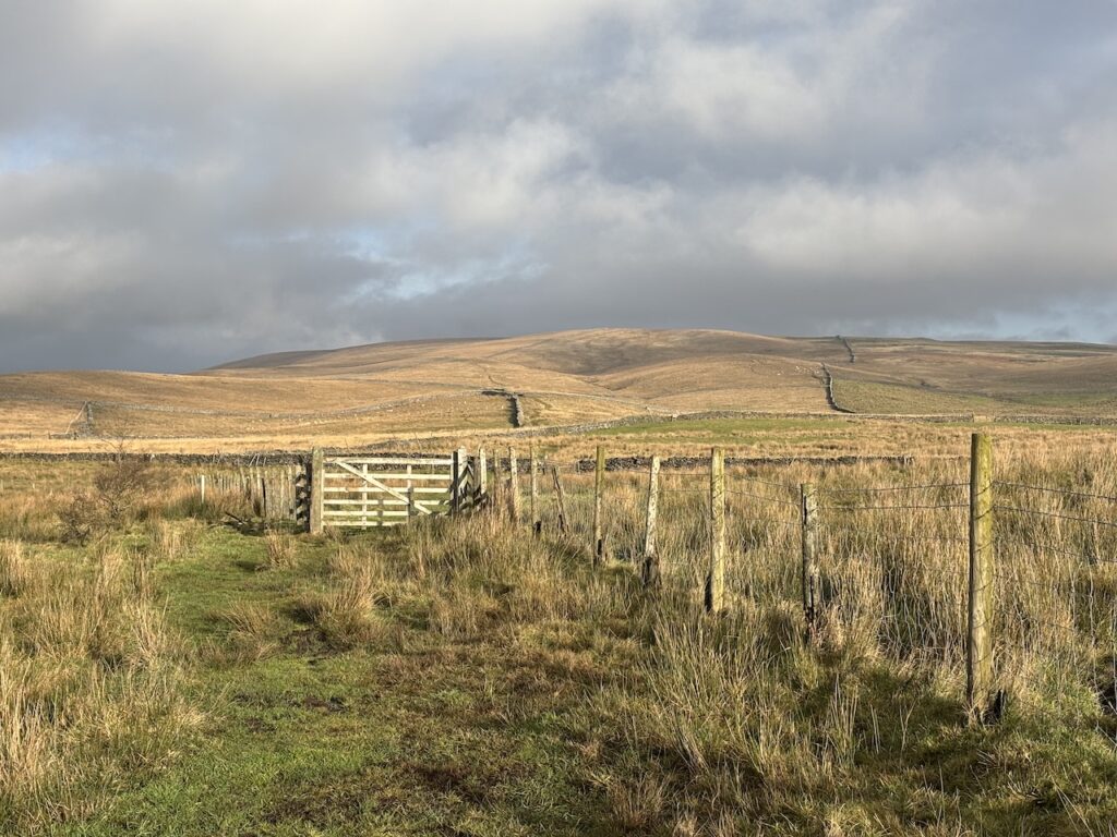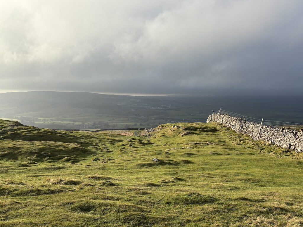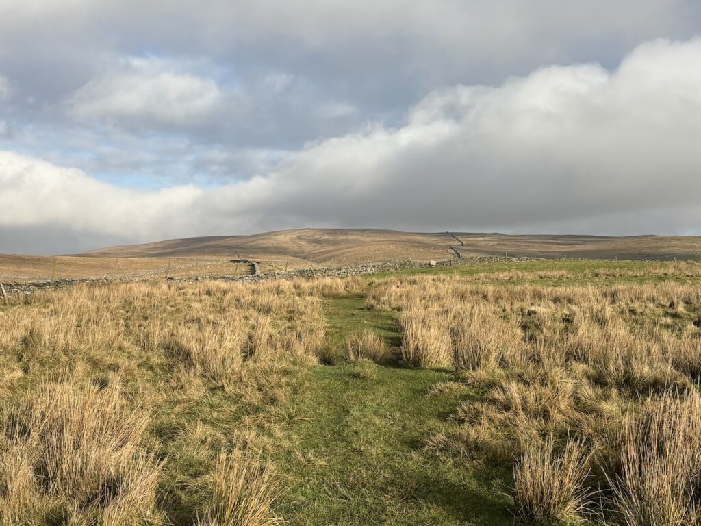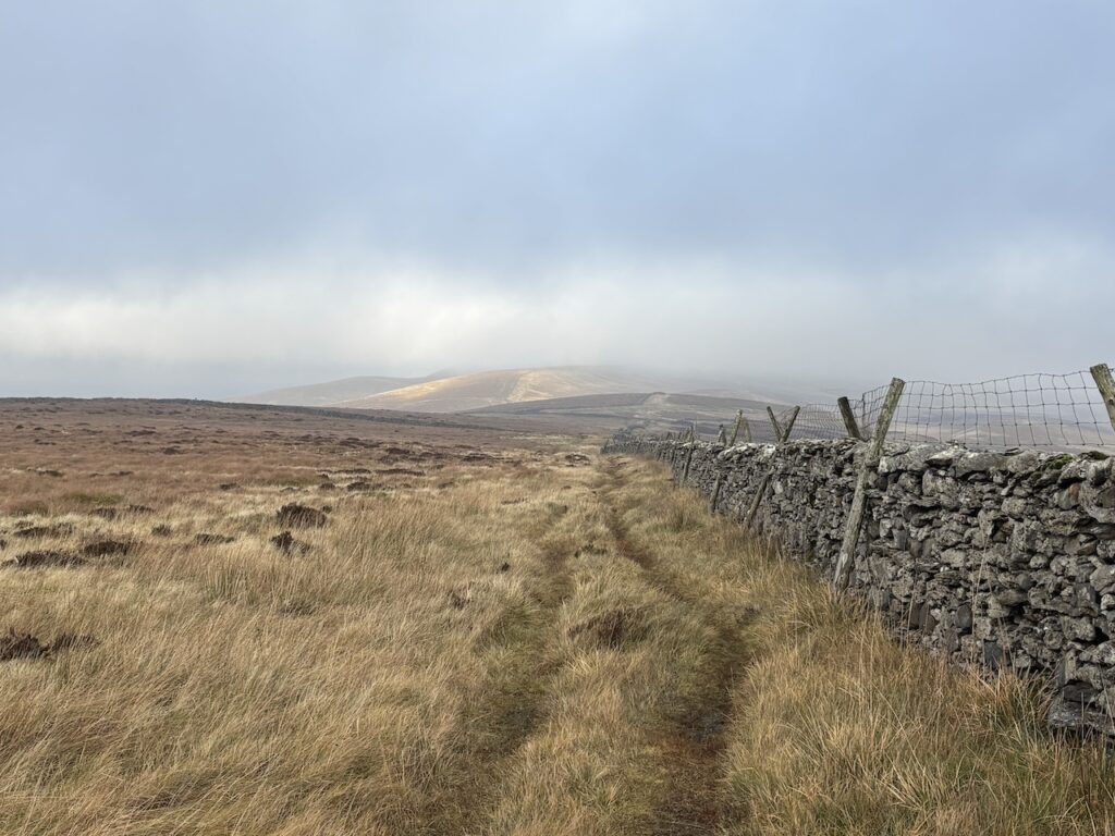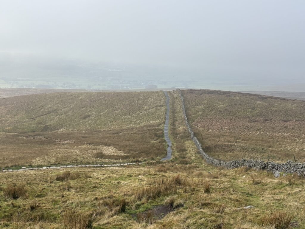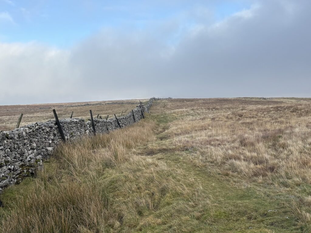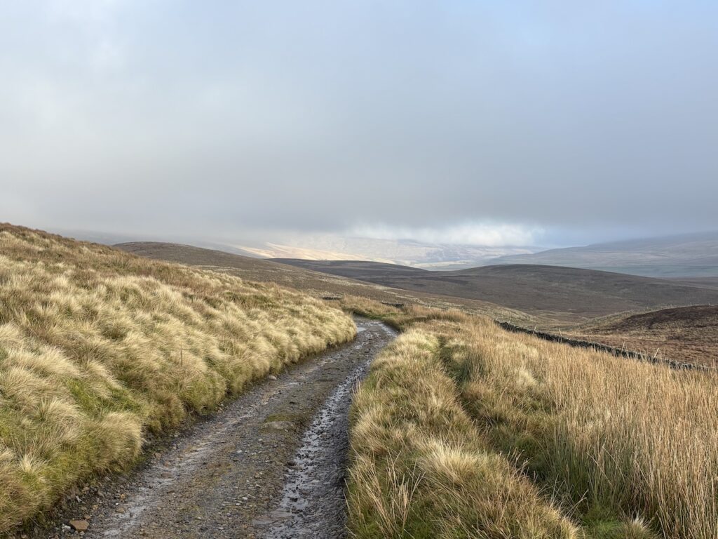 Just over 2.5km from Moor Head Lane we reach another track, Long Lane, and turn right. Despite the low cloud there are good views towards Foxup.