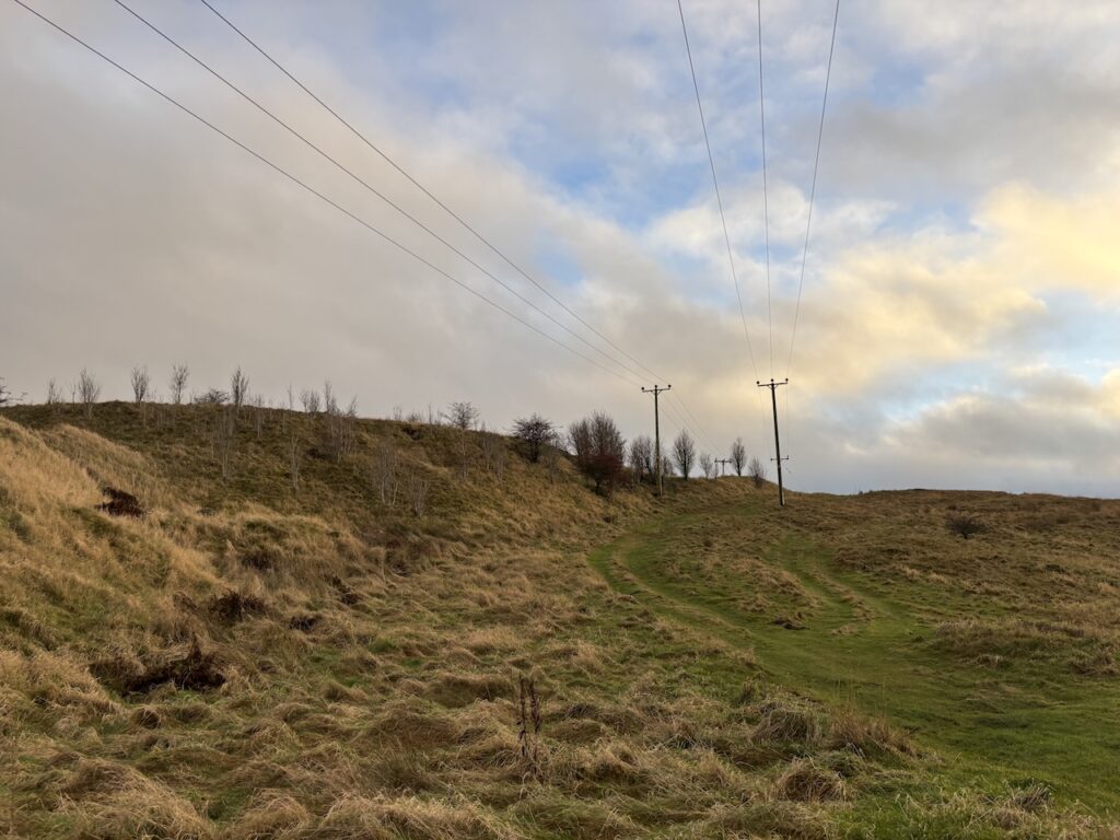 We are following a clear grass path through the rough pasture leading diagonally across the field towards Long Lane.