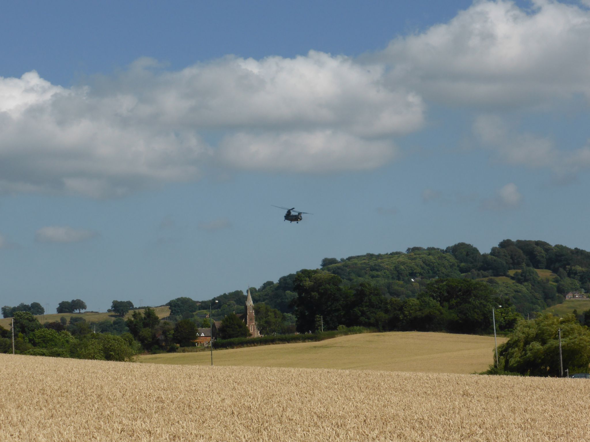Leaving Ashley Farm CL we turn left along Grafton Lane and in just under half a mile climb a stile on the right to follow a footpath through a field of sheep, after another stile we cross a field of wheat following what looks like a path through the crops. A Chinook flies low across in front of us, an impressive site.